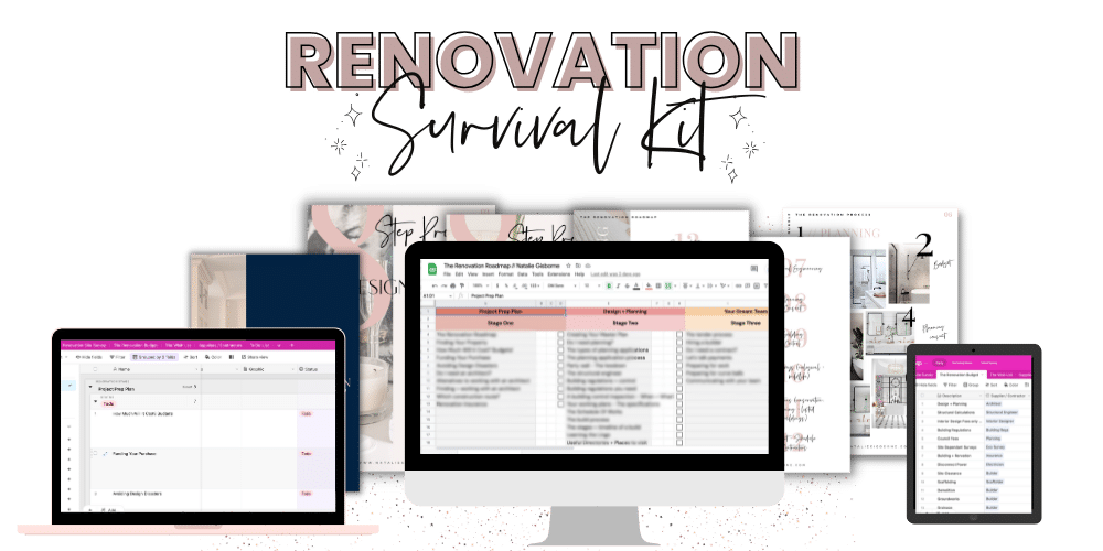 The Renovation Survival Kit is a three part intuitive set of tools and trainings, that breaks down every phase, step and task involved in your renovation, whilst keeping you organised, on budget & on track.